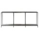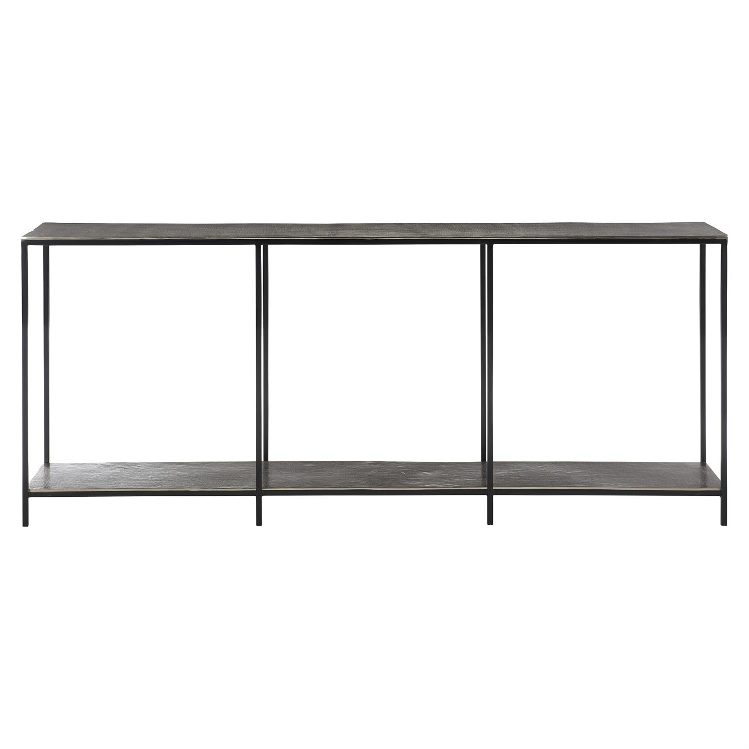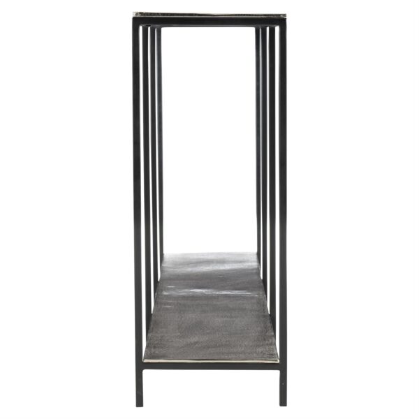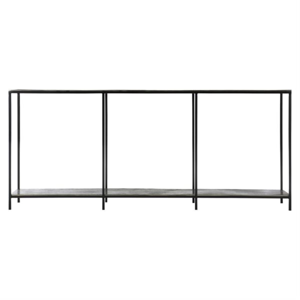 The Amira console table is a study in modern lines and symmetry. Drawing influence from Bauhaus design, it features a rectangular top, bottom shelf and open center. Cast aluminum surfaces rest upon a black iron frame for a chic industrial look.