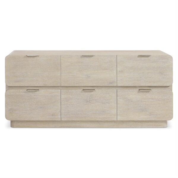 Elemental design gets a refined and modern update for the Arthur dresser. Softened corners and shapely drawer fronts have an organic simplicity with the rustic natural oak finish. The case is supported with a plinth base and features six pull-to-open drawers with cast aluminum pulls.