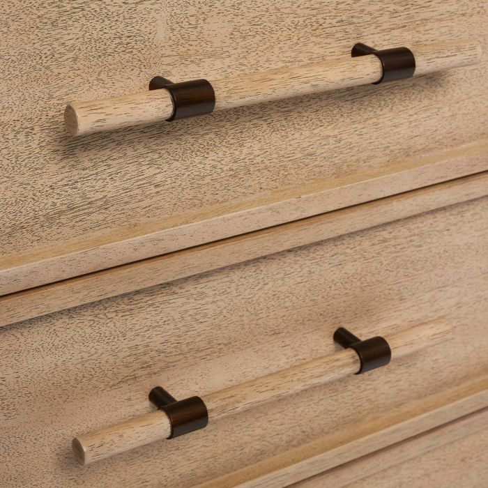 Crafted of mahogany in a washed taupe finish and featuring faux horn and brushed brass metal hardware, the Baker Petite Bedside Chest showcases integrity and artisanal vibes.