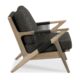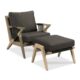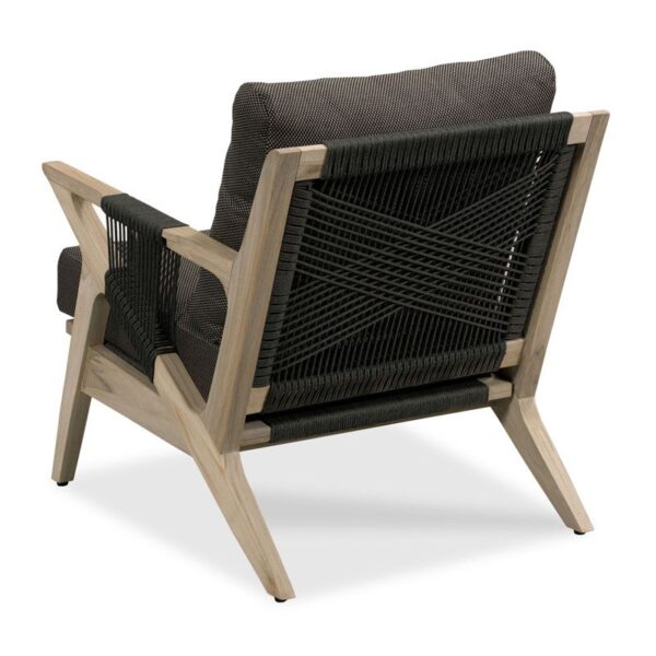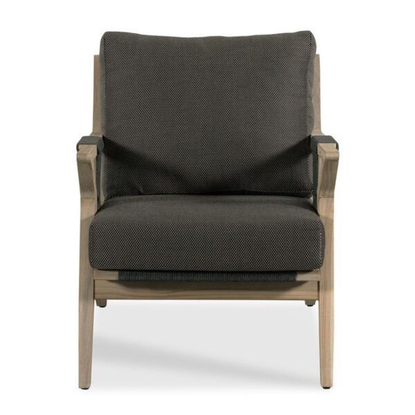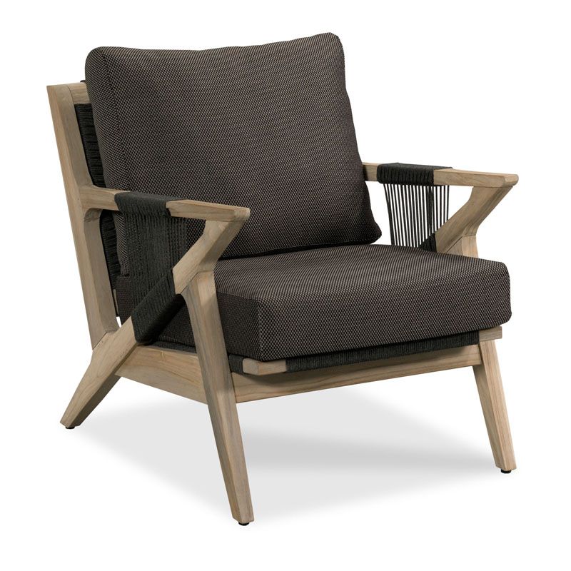 A relaxed chair, adapted from a Hans Wegner 1960’s original, with a rope woven back supporting an ample back cushion above an upholstered seat cushion that is flanked by wood rope weave arms raised on tapering shaped legs.