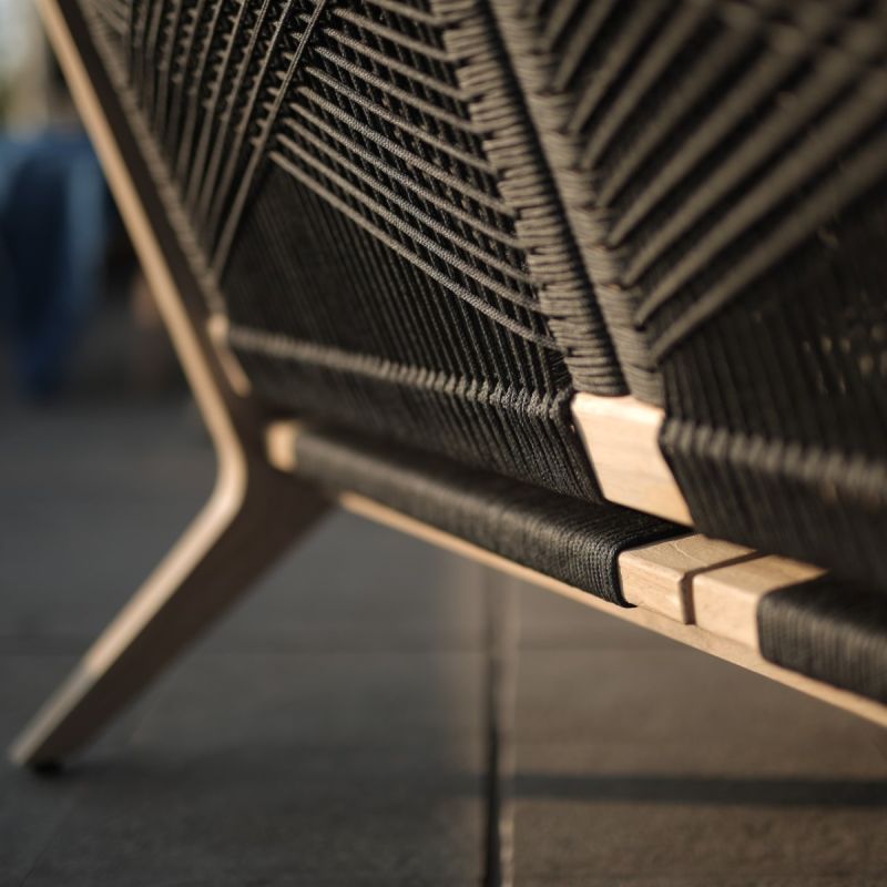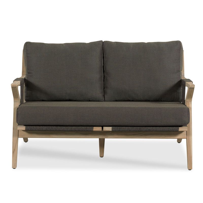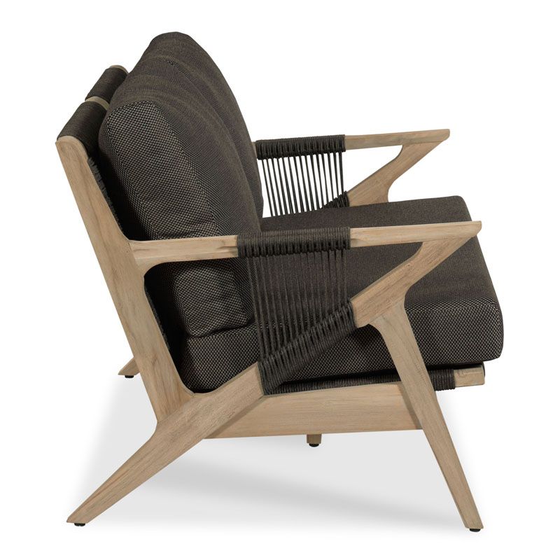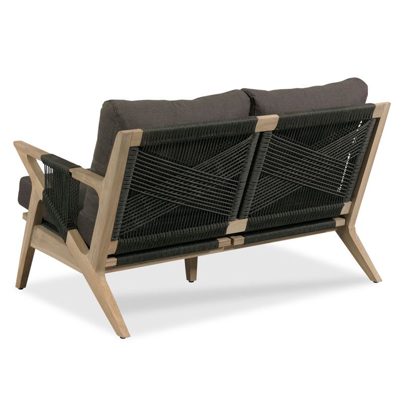 A relaxed loveseat, adapted from a Hans Wegner 1960’s original, with a rope woven back supporting ample back cushions above upholstered seat cushions that is flanked by wood rope weave arms raised on tapering shaped legs.