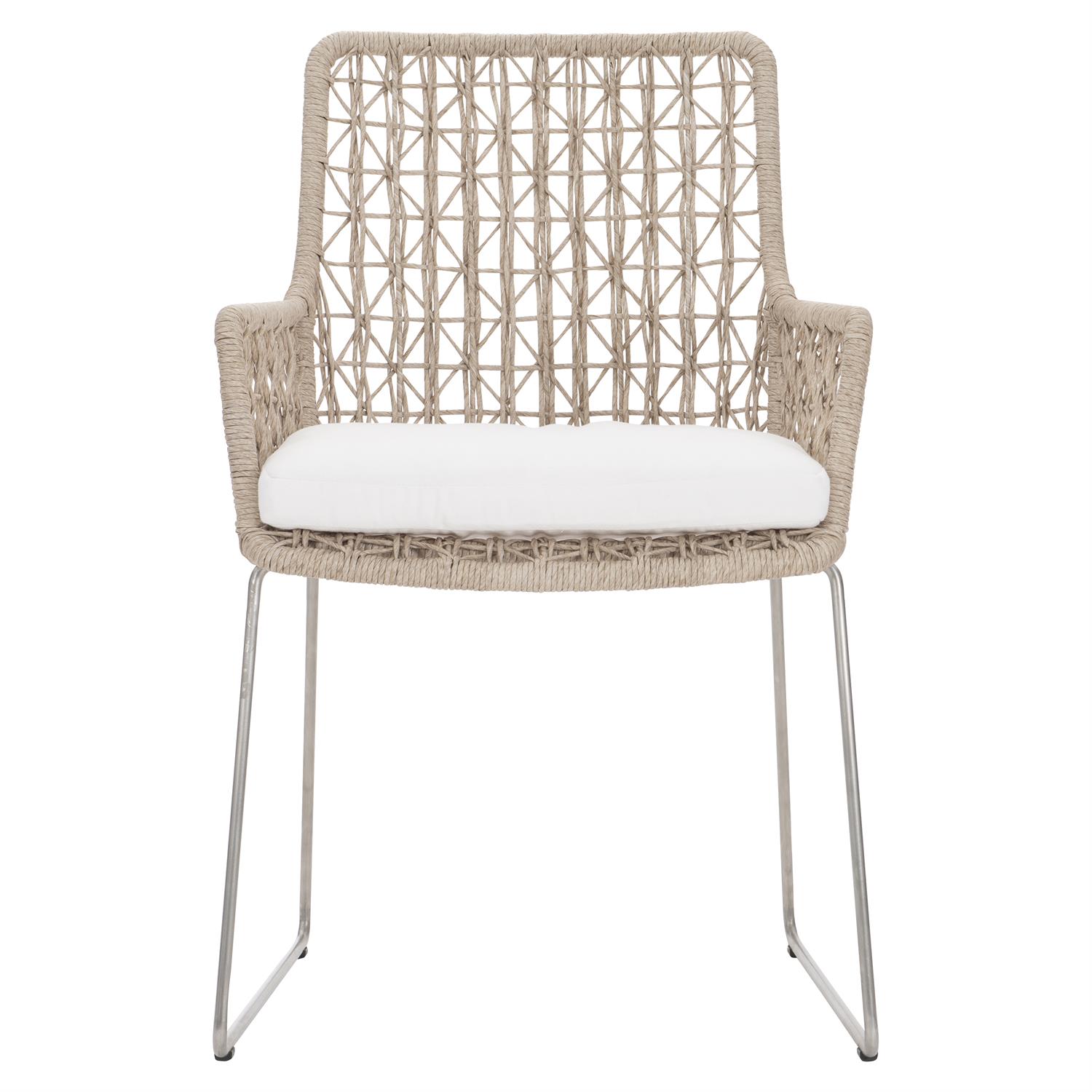 Striking design comes from an open weave crafted of twisted abaca all-weather wicker on the Celeste arm chair. But the pattern isn’t just about style, it also provides a comfortable back for outdoor lounging. Woven over a stainless steel base, the wicker is made to withstand weather conditions outdoors but is beautiful enough for indoor rooms.