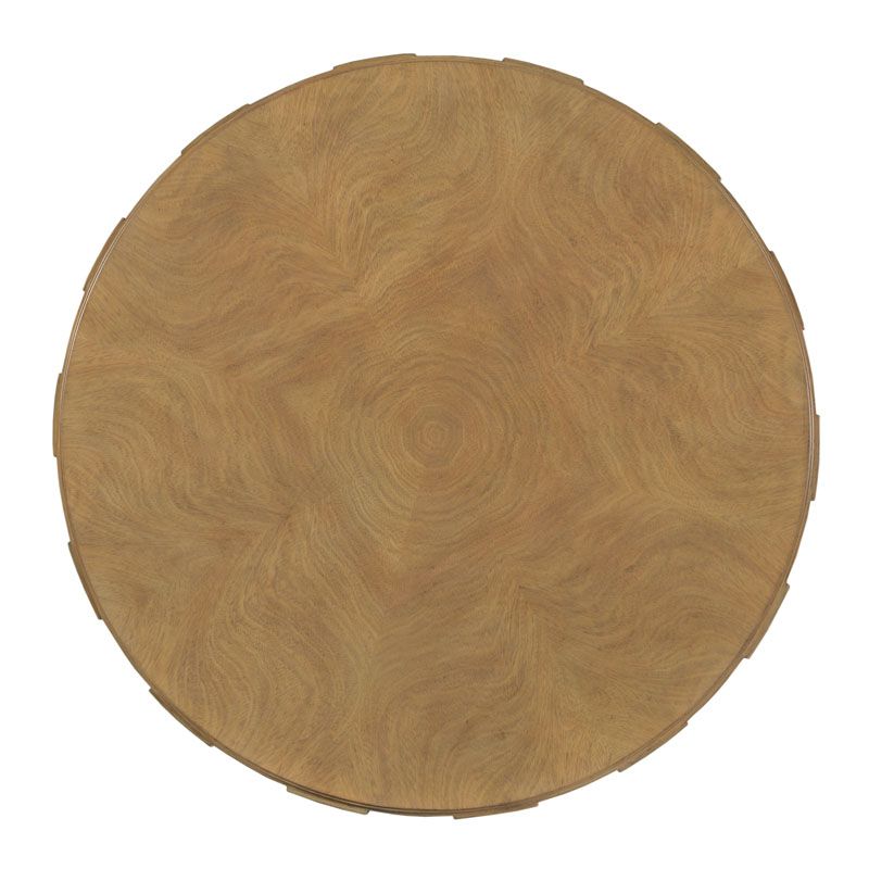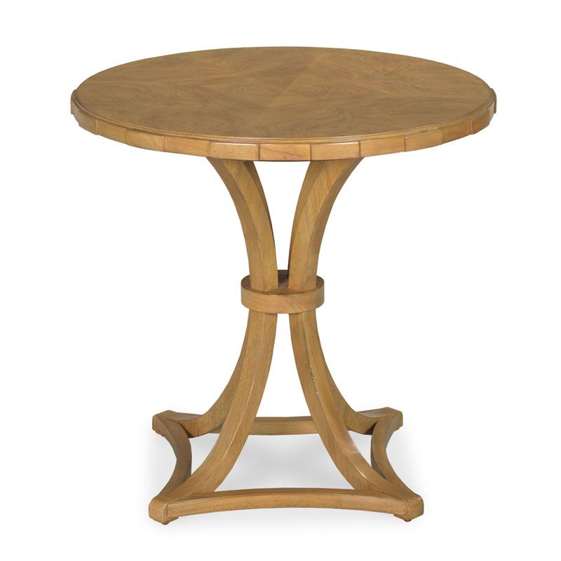 A lovely table inspired by 18th Century Georgian architecture. A circular cerejeira top is accented by a dentil perimeter molding over four curved legs that are joined by a low stretcher.