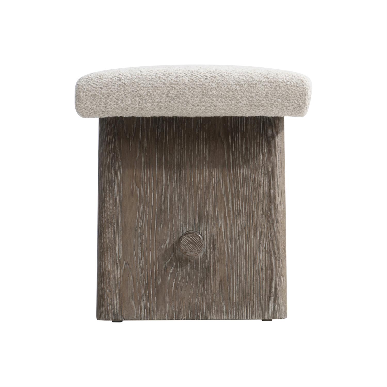 The Crew bench’s A-framed base is formed by two side panels and a dowel stretcher. The wooden base in stained oak finish supports an upholstered seat to provide both form and function.