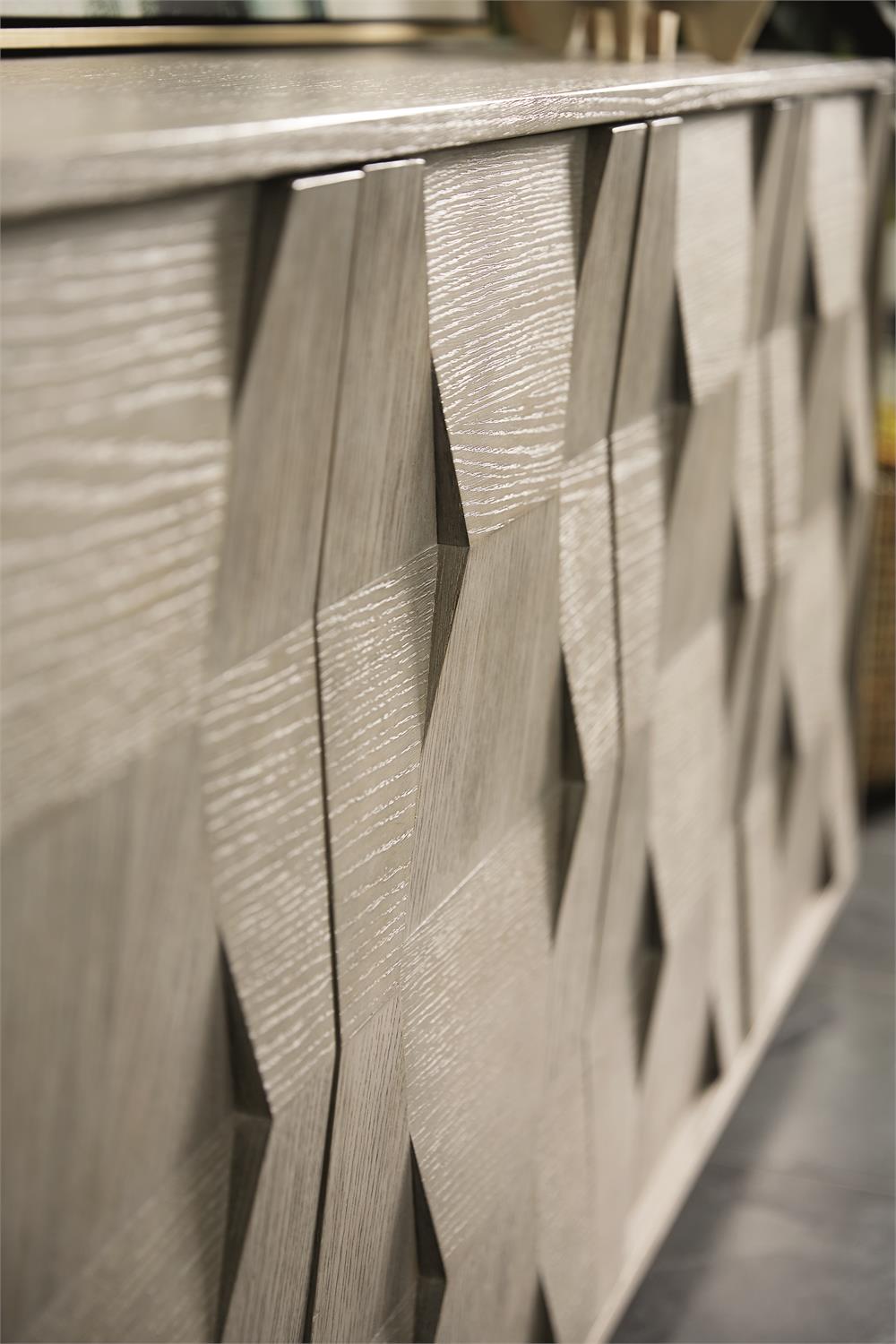 This four-door buffet is faced with three-dimensional fancy-face cerused oak veneers and is set on a delicate streamlined plinth base. Clean-lined and casual, it contributes a welcome warmth to any dining room.