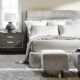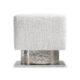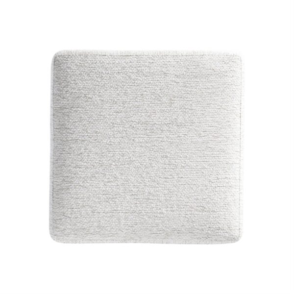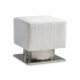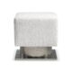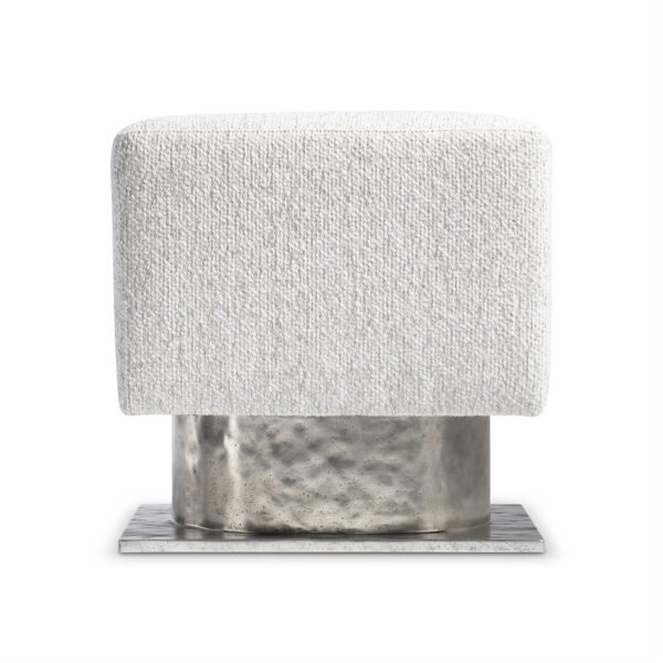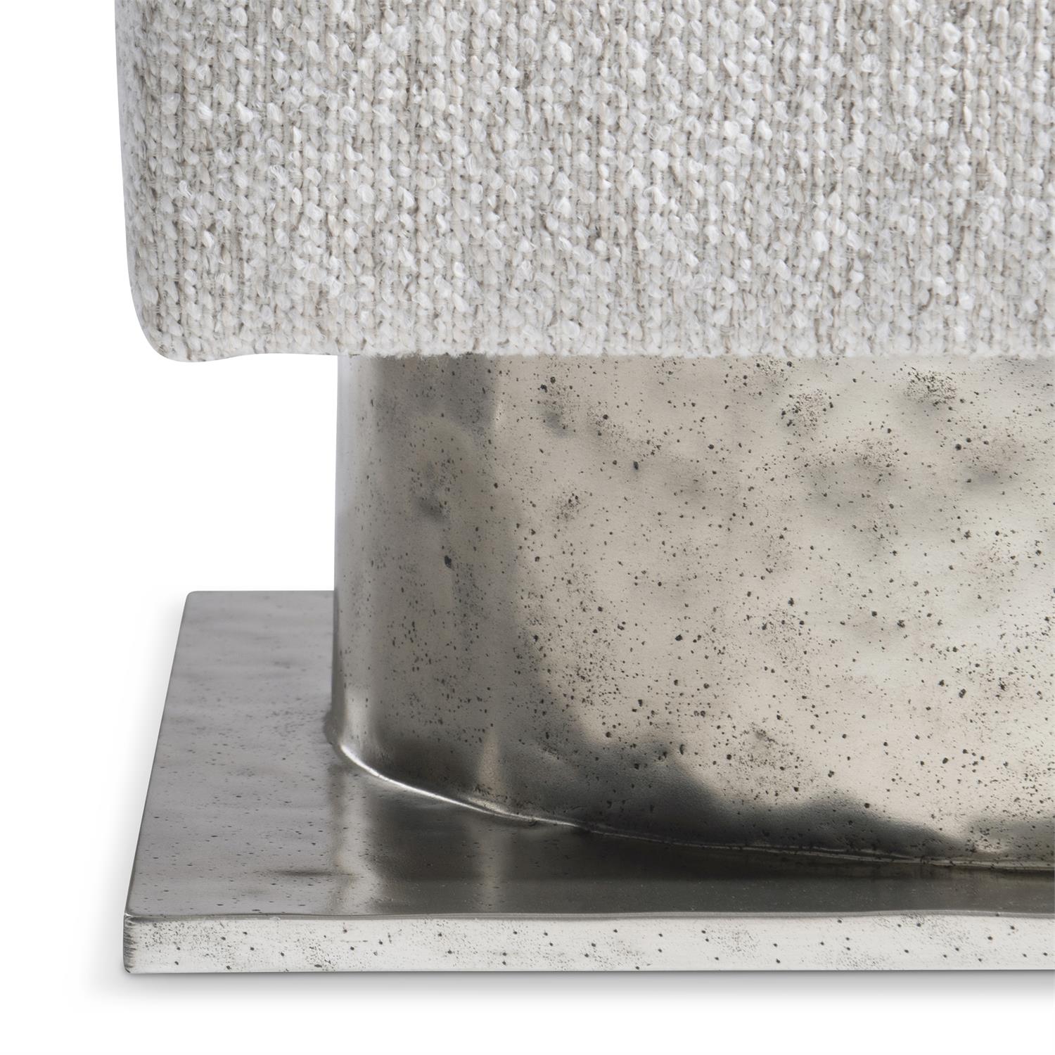 The Demi bench design is inspired by modern architecture, with a square upholstered seat floating above a metal base. The base is formed with a round textured cast aluminum pedestal and square plinth finished in textured aluminum.