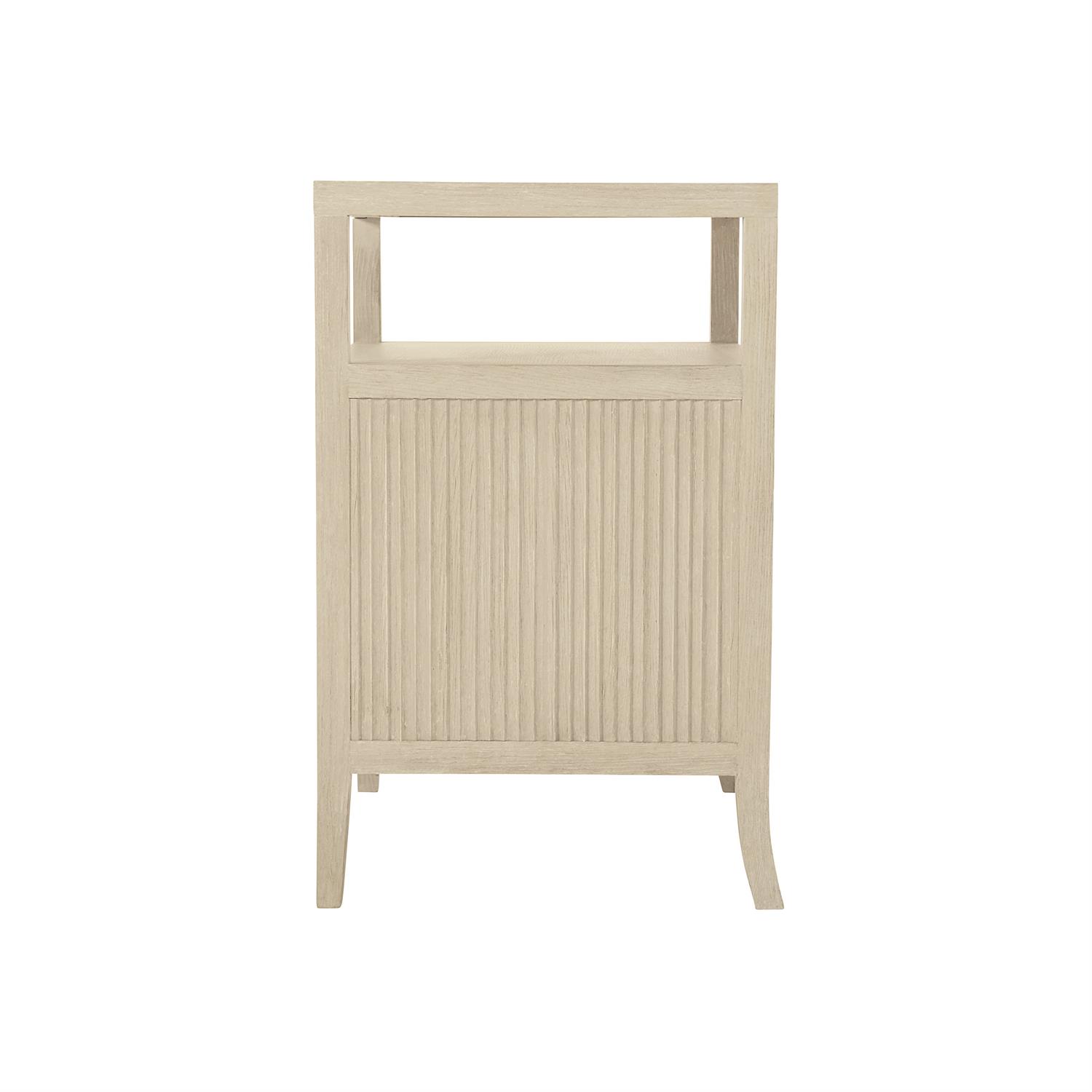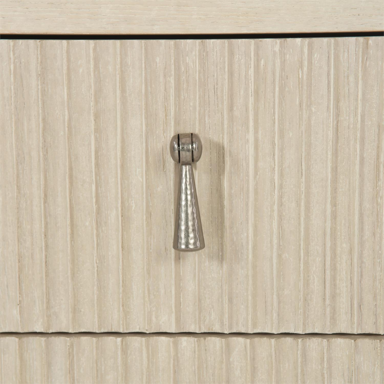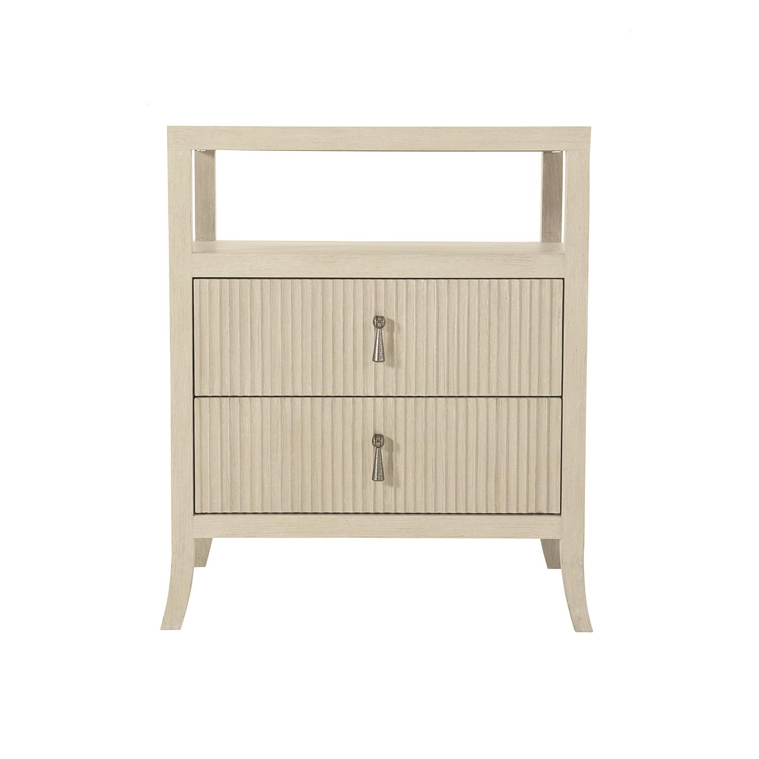 The Elliot nightstand achieves a clean, modern aesthetic, while soft finishes and graceful curves add feminine appeal. Cast beaded drawer fronts feature tapered drop pulls finished in aged silver. The delicate luster of these metal accents blends seamlessly with the subtle coastal finish, contributing to the sophisticated style of the piece. Neither too formal nor too casual, this nightstand brings an air of softness and refinement to an interior.