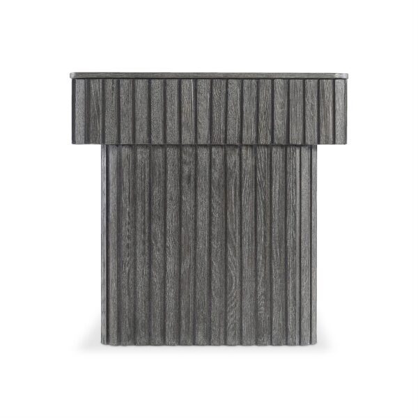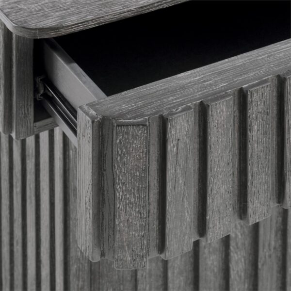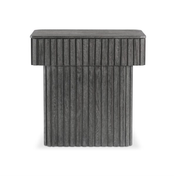 Inspired by architectural design, the Finn nightstand features deep linear reeding around the base and the sides of the top, with a smooth table surface. A hidden pull-to-open drawer is accessed with a finger pull. The deeply textured woodgrain is highlighted with the ebonized oak finish.
