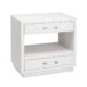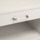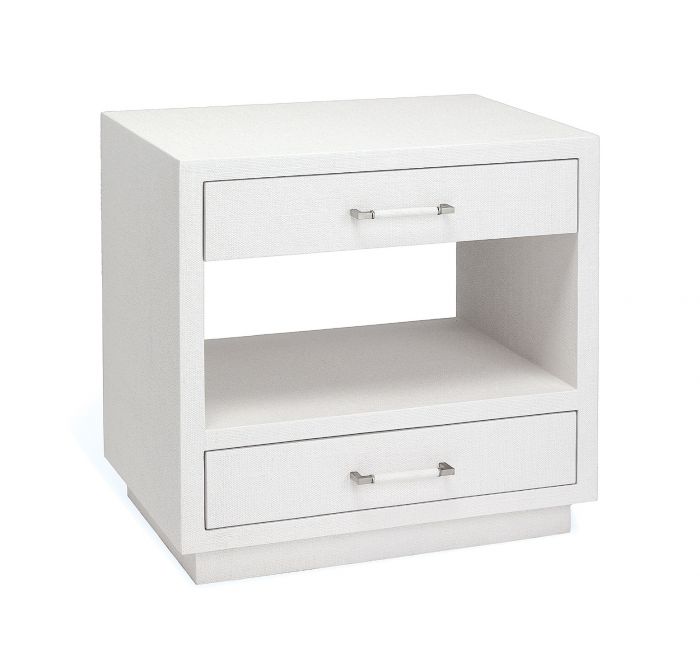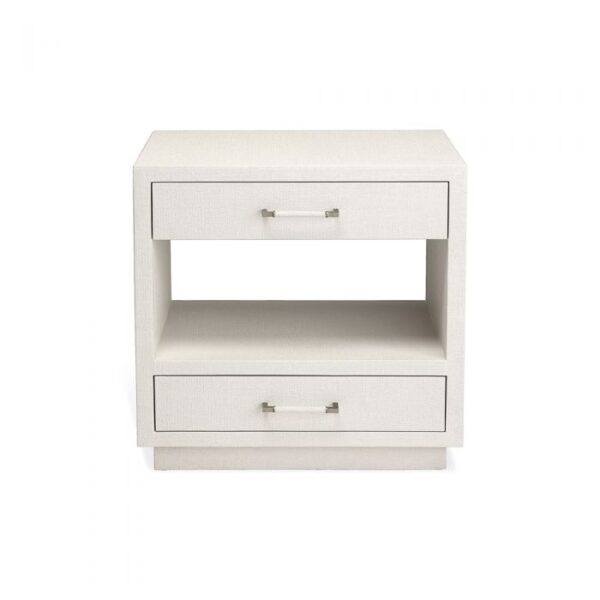 The clean lines of the Grayson Bedside Chest are transformed into a statement piece thanks to the texture of natural white faux linen and metal pulls in champagne silver.