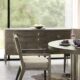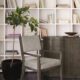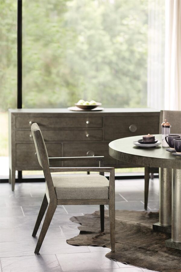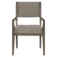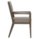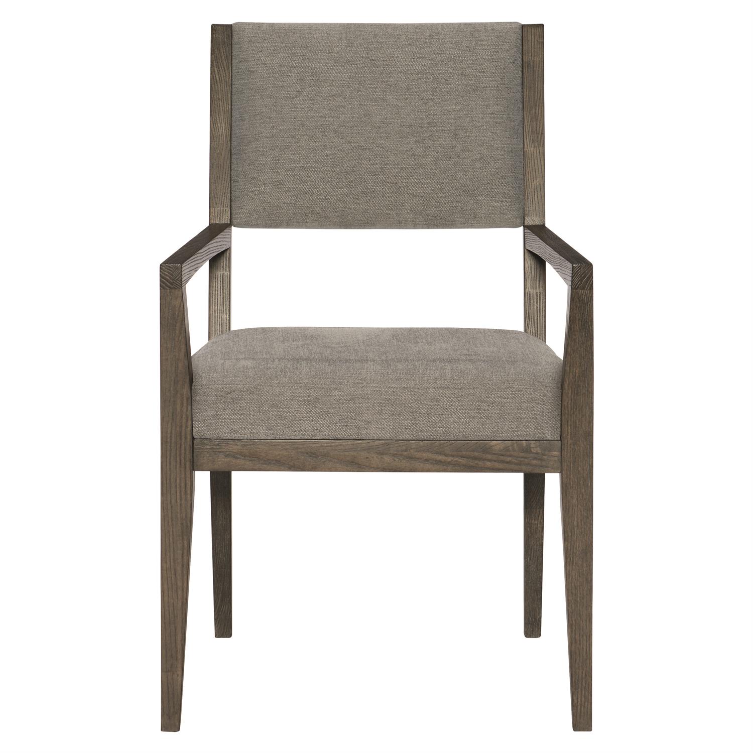 For a casually sophisticated look, the Griffin armchair combines a clean modern design with a rustic finish and soft, textured fabric. A pitched back and tapered legs form a sleek profile with dynamic, angular lines. The gray fabric tone on the upholstered seat and half back perfectly complements the charcoal oak finish.