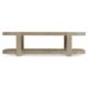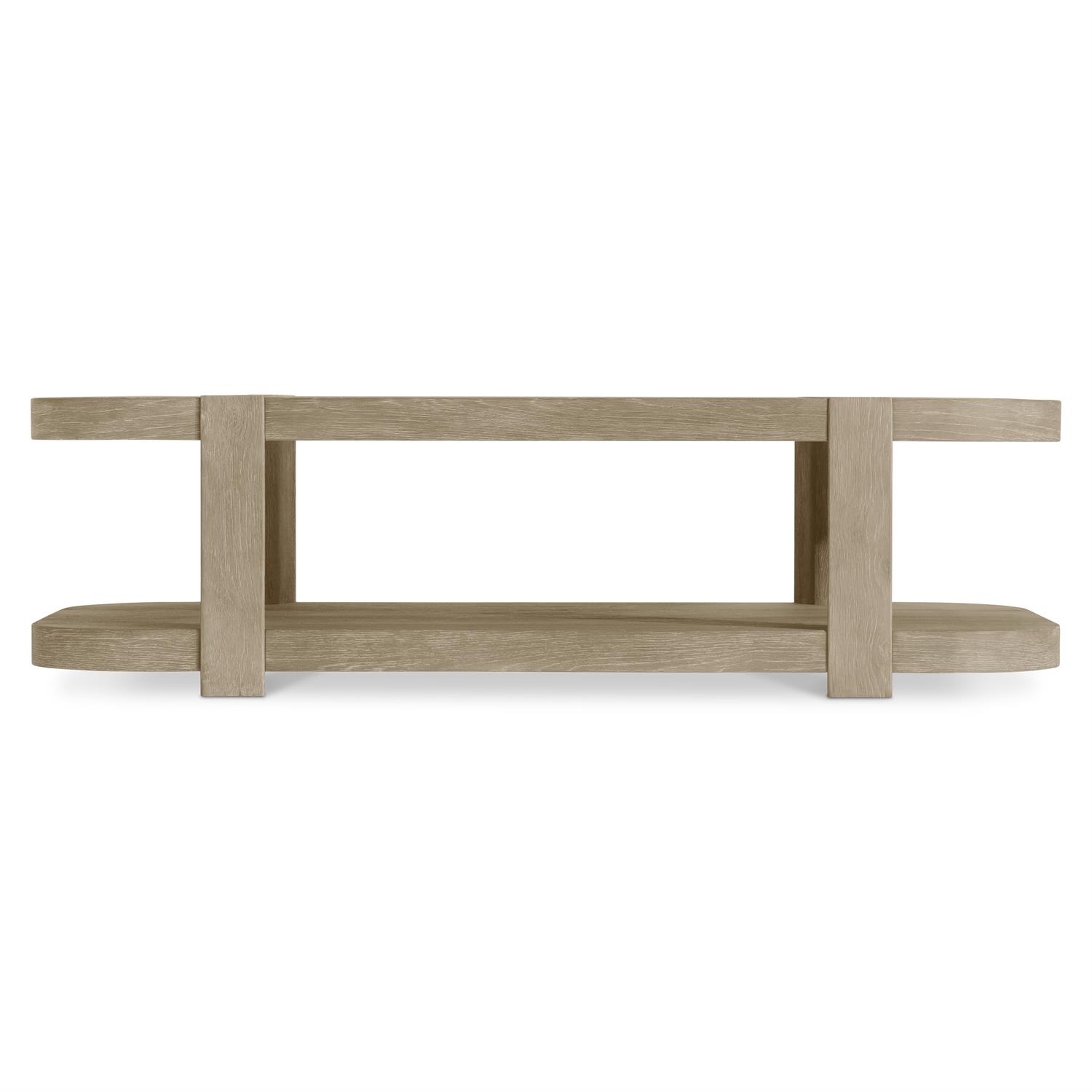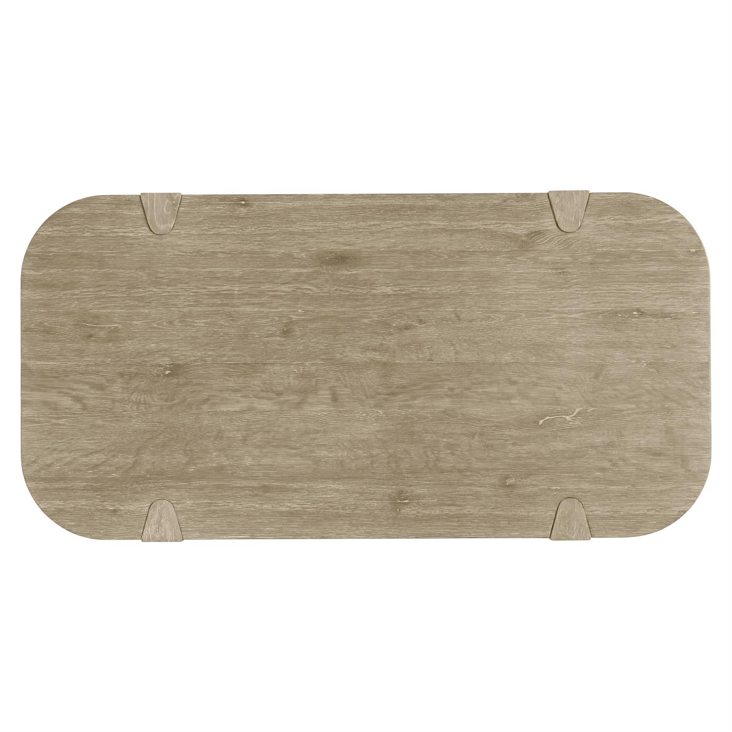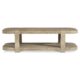 Shaped legs notch into the top and lower shelf of the Hadley coffee table, appearing to wrap over the top for a unique design. Rounded corners add a modern take on this traditional look. Clean lines and a rustic hazel finish offer rich character and relaxed style.