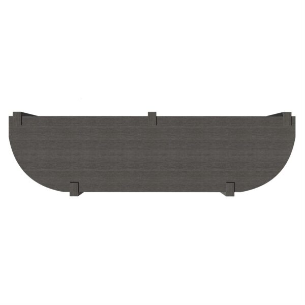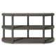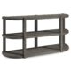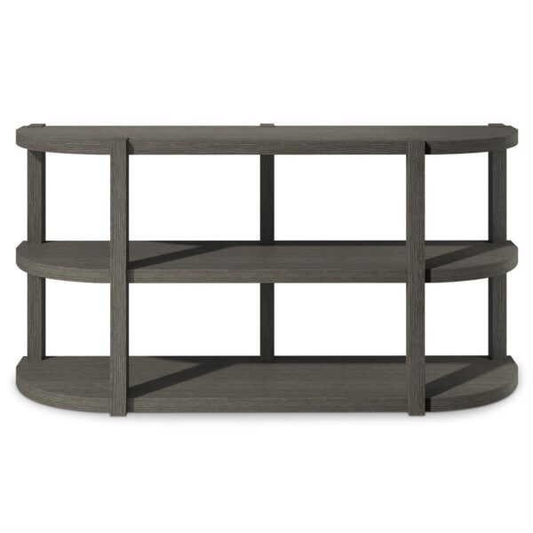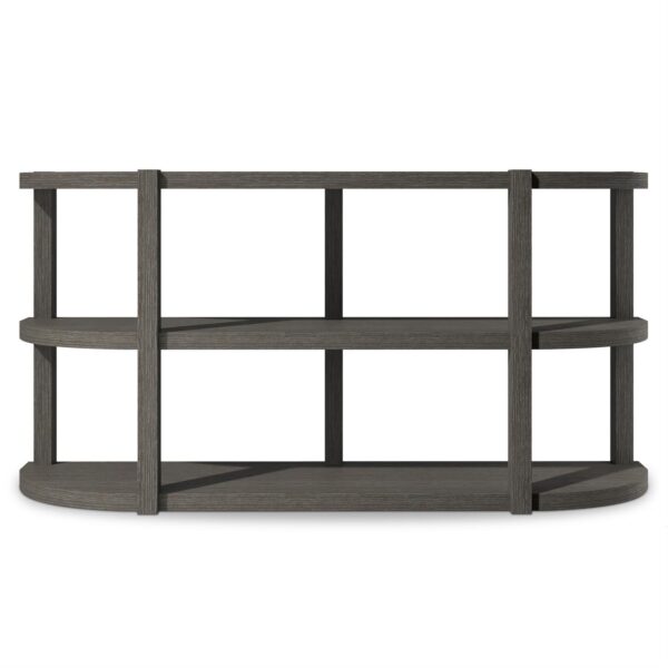 The Ivan console table takes an uncluttered and modern approach for its design. The top and two shelves are supported by five vertical posts, all in a rich graphite stained wood finish. The curved fronts of the shelves provide a beautiful counterpoint to the straight lines of the supports.