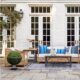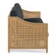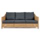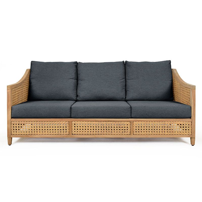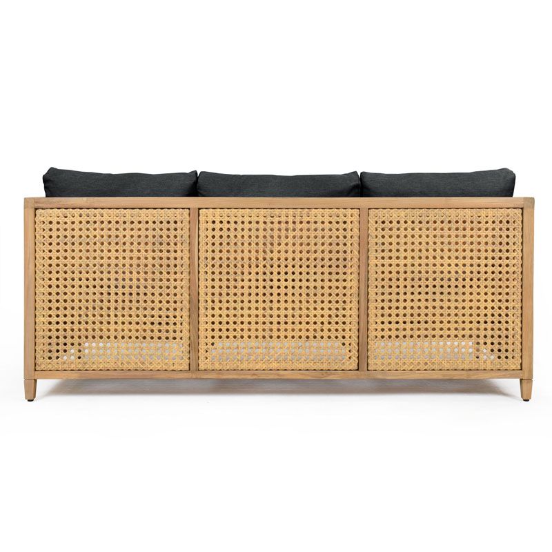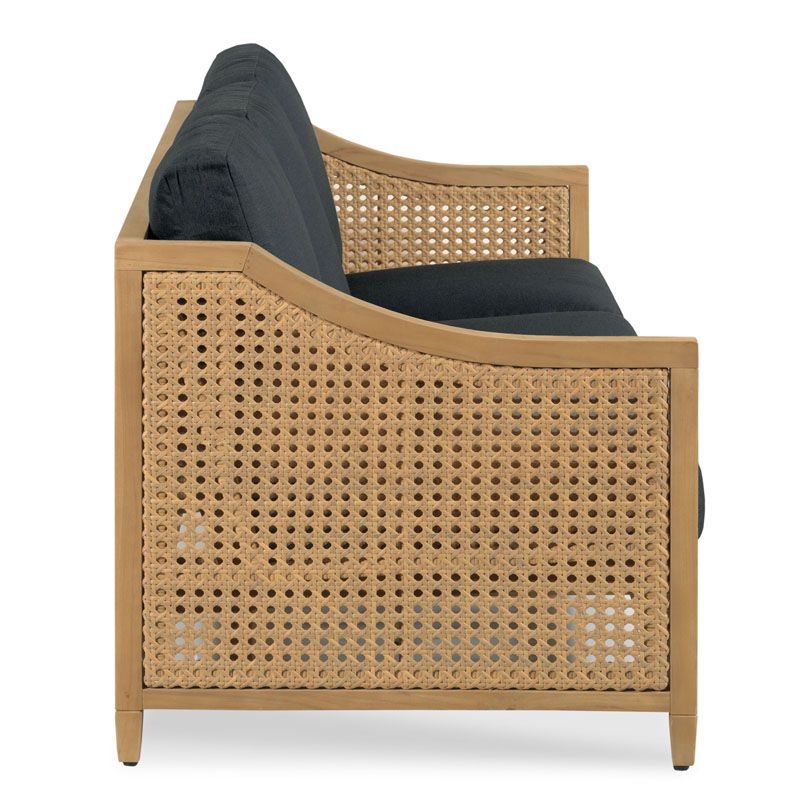 A sophisticated linear teak frame is accented by woven synthetic cane and fitted with three seat cushions and three back cushions.