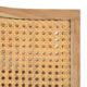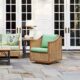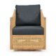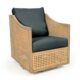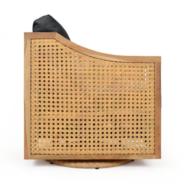 A sophisticated linear teak frame is accented by woven synthetic cane and fitted with a seat and back cushion. The chair rests on a gliding swivel creating a fun motion chair.