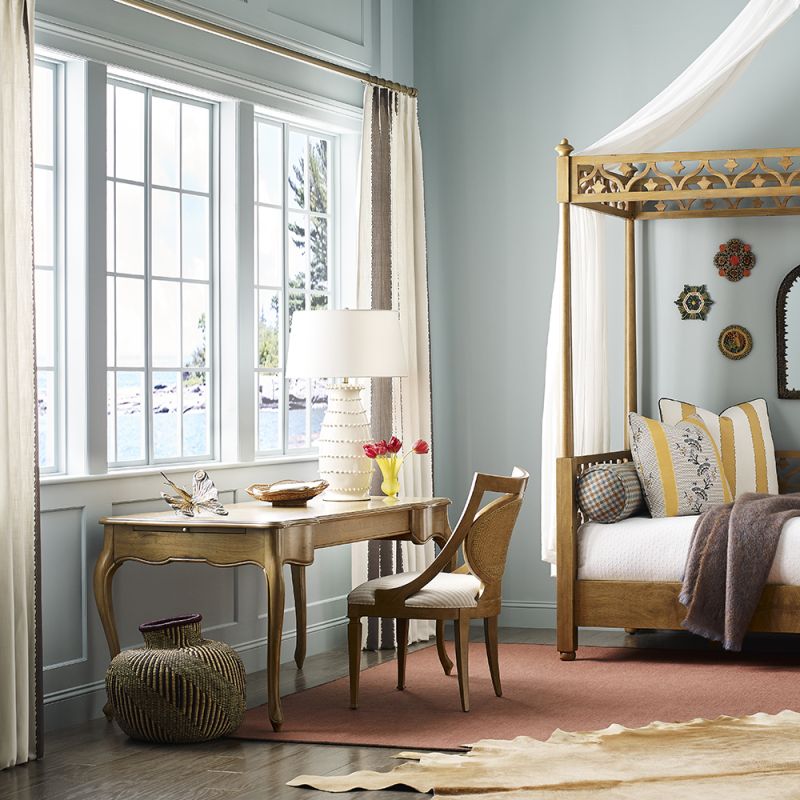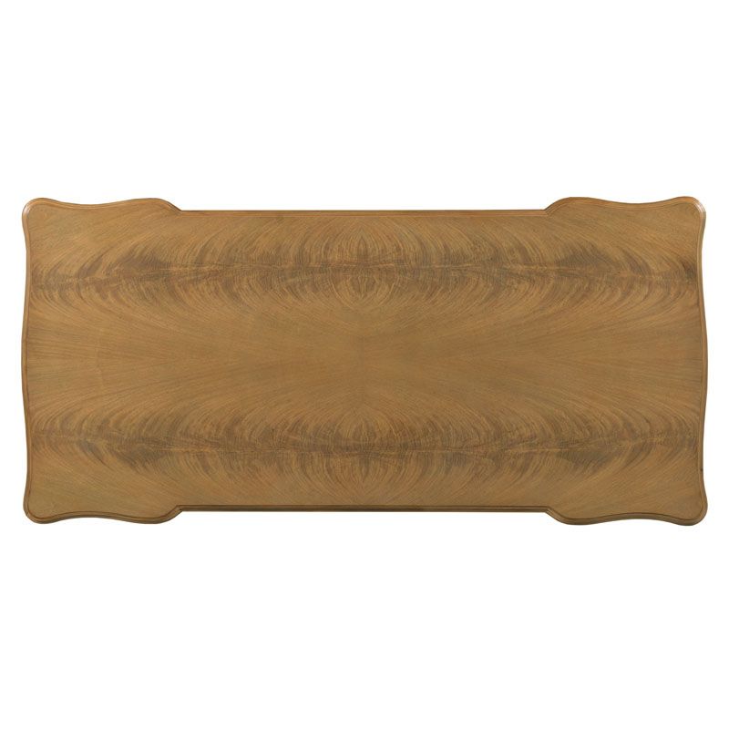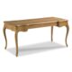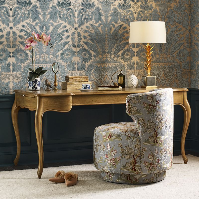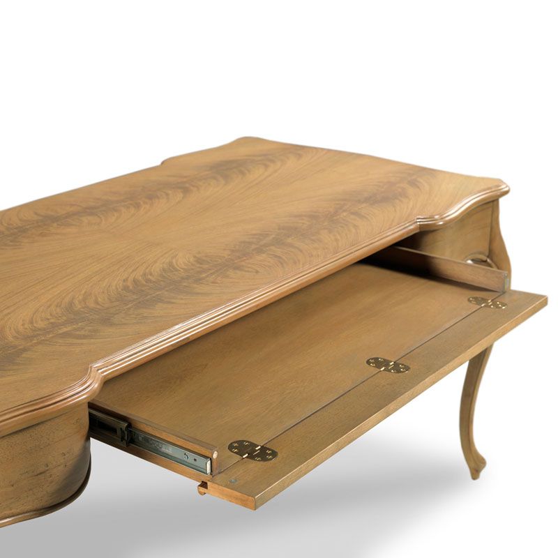 A handsome work table designed in the spirit of 18th Century French Louis XVI originals. A shaped molded rectangular top is fitted with pull-out work surfaces over a center drawer designed for keyboard use. The desk is elevated on stylized cabriole legs.