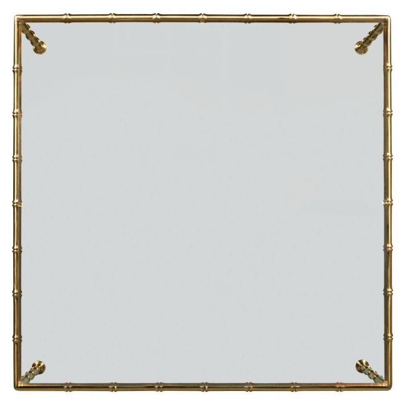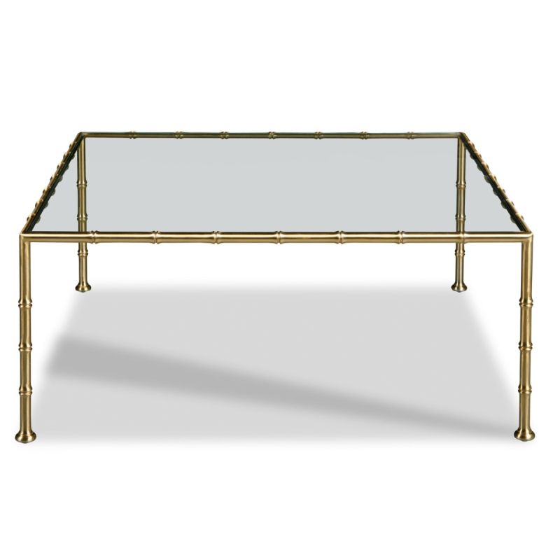 A lovely low table designed in the spirit of 19th century English Regency originals. The square top is fitted with a 3/8″ tempered glass top elevated on faux bamboo brass legs.
